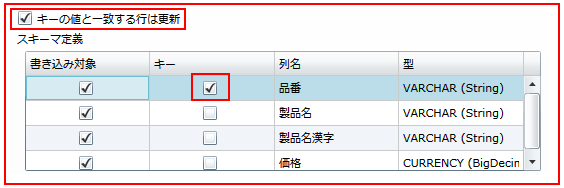 - [キーの値と一致する行は更新]にチェックを入れた場合、有効になります。
